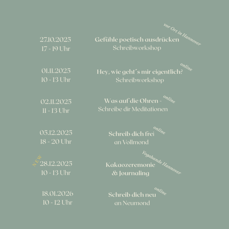 Bei jedem Workshop besteht die Möglichkeit, dich von mir 1:1 begleiten zu lassen. Deine Texte haben eine Botschaft für dich, denn sie sind mehr als Worte auf Papier. Sie sind Spiegel deiner Gedanken und Muster. Sie sind Schlüssel zu deinen Potenzialen und Ressourcen. Lass uns gemeinsam herausfinden, was deine Texte dir sagen wollen.